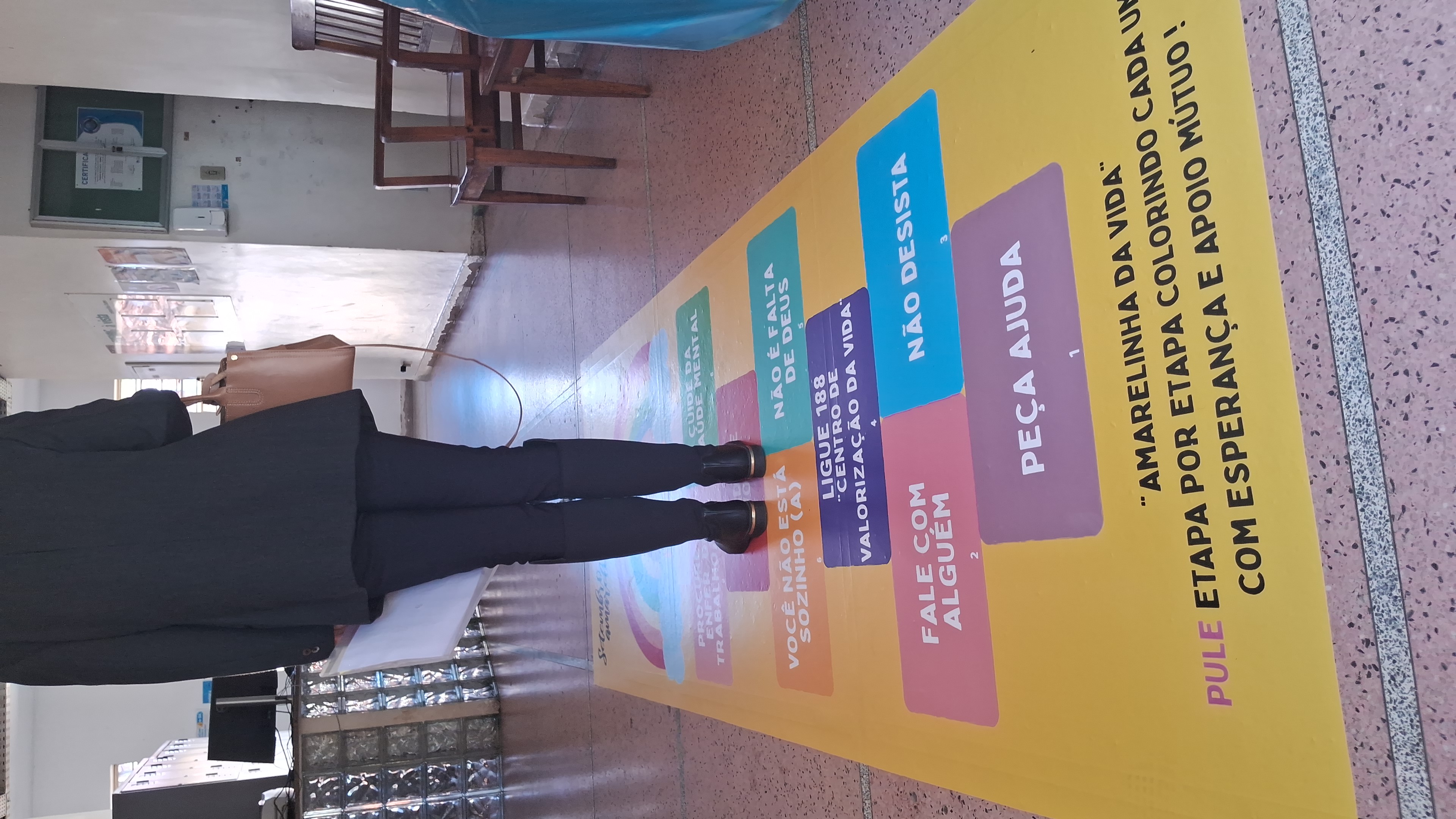 O chão do hall de entrada do instituto ganhou destaque com a “Amarelinha da Vida” - na qual cada casa trazia uma frase, promovendo reflexões sobre as nuances em torno do suicídio e servindo como base para realização de dinâmicas e divulgação sobre o serviço de psicologia da Gerência de Saúde e Segurança do Trabalhador da Fhemig.
